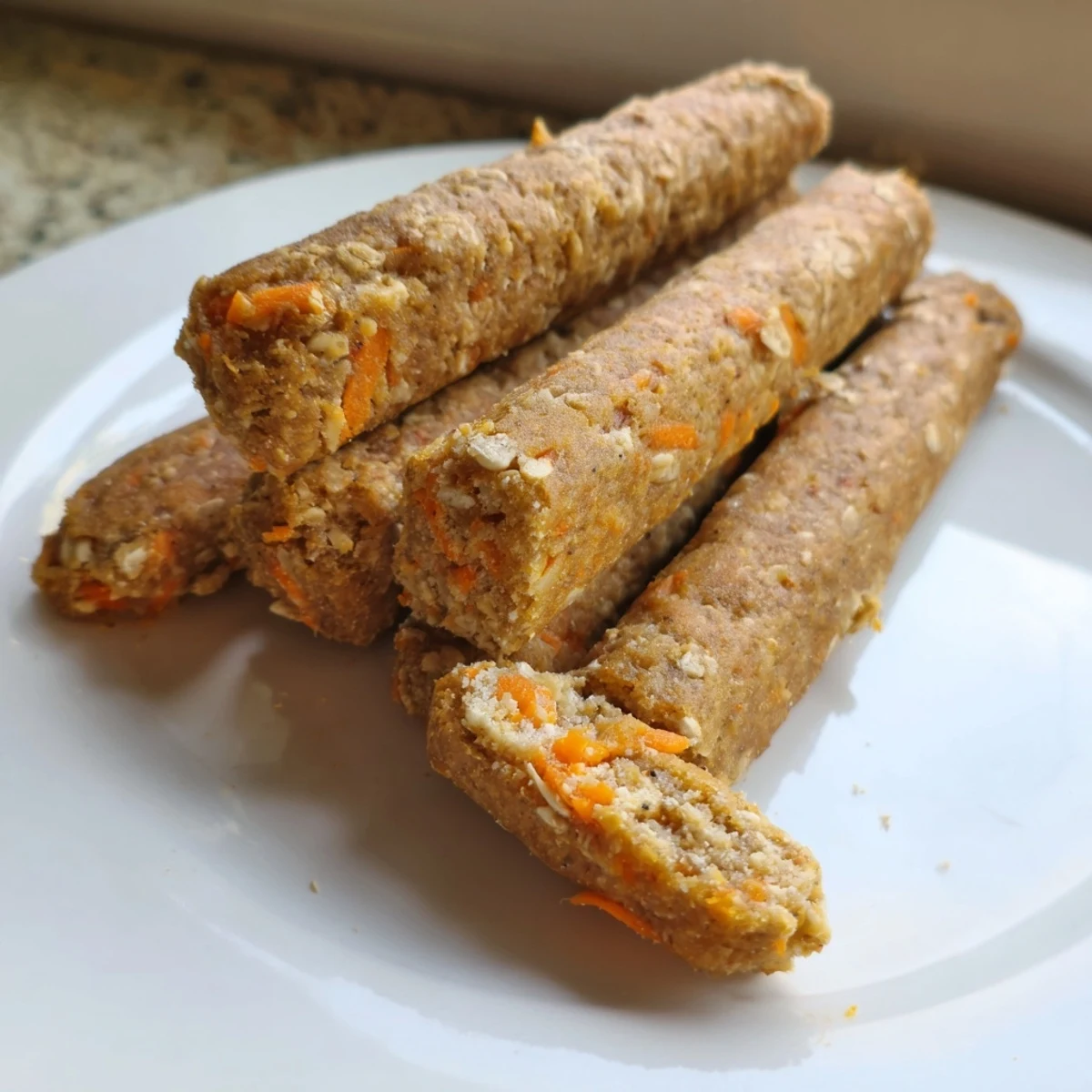 These wholesome apple and carrot chew sticks combine fresh grated produce with whole wheat flour and oats for a nutritious dog treat your pup will love. The dough comes together quickly with egg and applesauce, then bakes into firm, satisfying sticks perfect for keeping dogs occupied. With just 15 minutes of prep time and a simple baking process, you can make 16 portable treats that store beautifully in the freezer for busy pet parents.