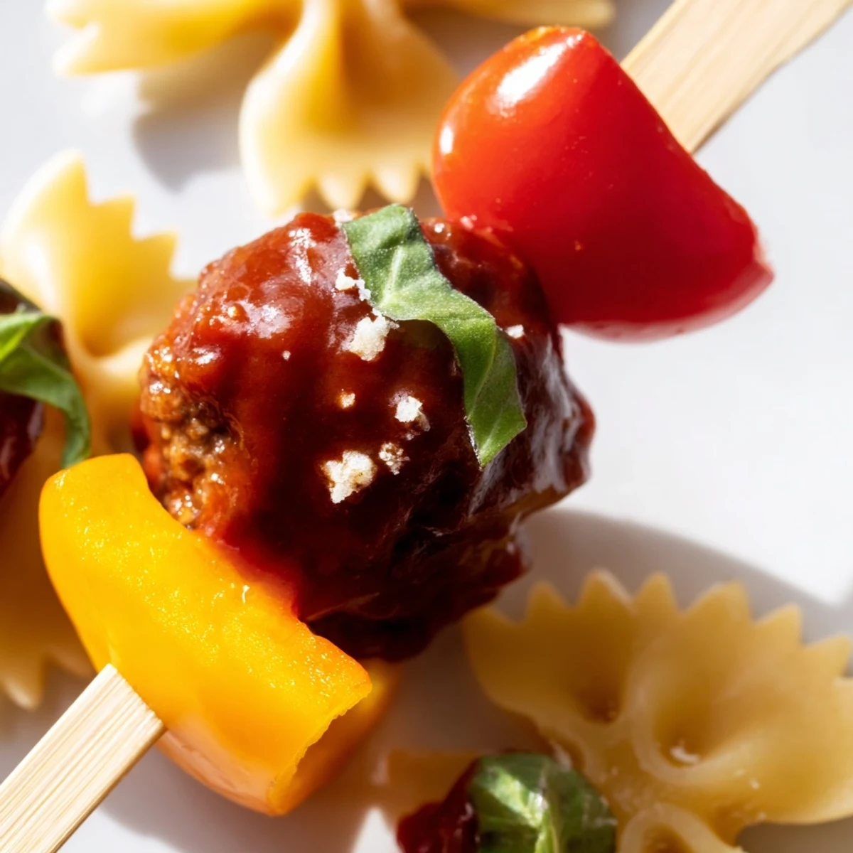 These playful skewers feature al dente bowtie pasta alternating with savory cocktail meatballs, crisp bell pepper pieces, and sweet grape tomatoes. The meatballs get a quick coating of warmed barbecue or marinara sauce blended with honey and Italian seasoning for a sticky, flavorful glaze.